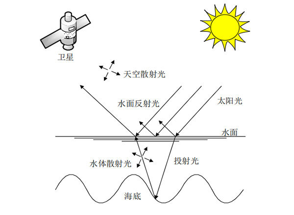自然界中的全部物質(zhì)都具有光譜特征,不同物質(zhì)的光譜特性不同,光譜的差異與物質(zhì)的差異呈正相關(guān)。海洋水質(zhì)遙感監(jiān)測的原理是根據(jù)純凈水體和其他水體具有不同的光譜特性,在衛(wèi)星上搭載傳感器接收一定波長范圍內(nèi)的輻射值,分析水質(zhì)參數(shù)對特定波長的光的吸收和散射情況,結(jié)合光譜和水質(zhì)參數(shù)濃度的數(shù)學(xué)關(guān)系,最終反演出各種水質(zhì)參數(shù)的濃度值。如下圖所示,衛(wèi)星遙感監(jiān)測時(shí)衛(wèi)星上的傳感器接收到三部分的太陽輻射: