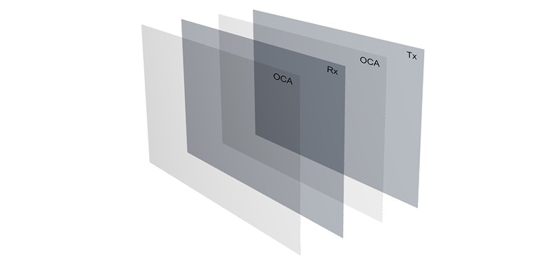 例如我司產(chǎn)品采用的是金屬網(wǎng)格FF的貼合方式,由光學(xué)膠+Rx電極和光學(xué)膠+Tx電極貼合而成。