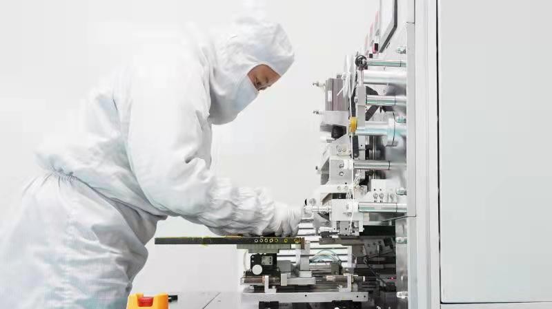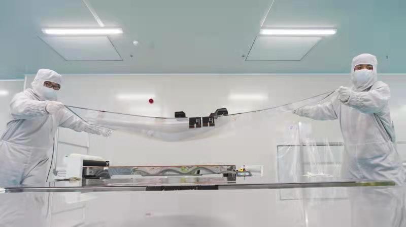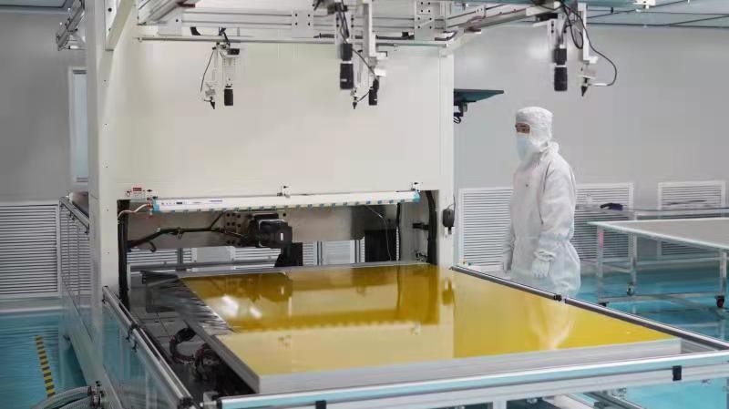 ? ? ? ? 2月9日,高新區(qū)松柏電子生產(chǎn)車間,2名工人合力將一張86寸觸摸屏移下操作平臺(tái)。